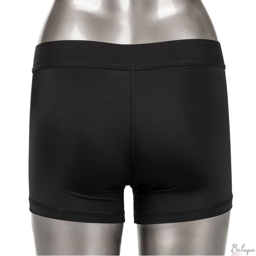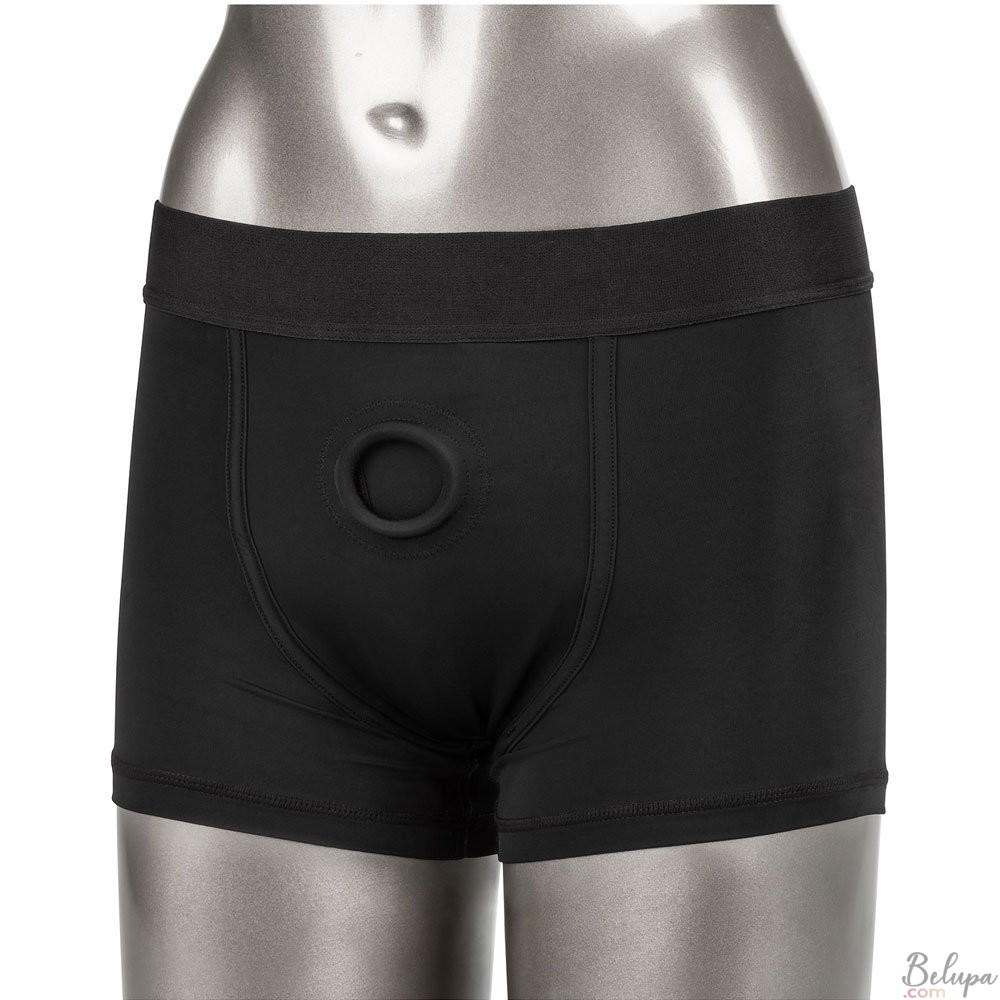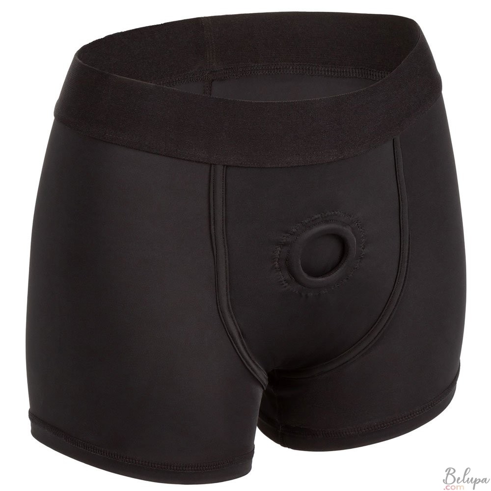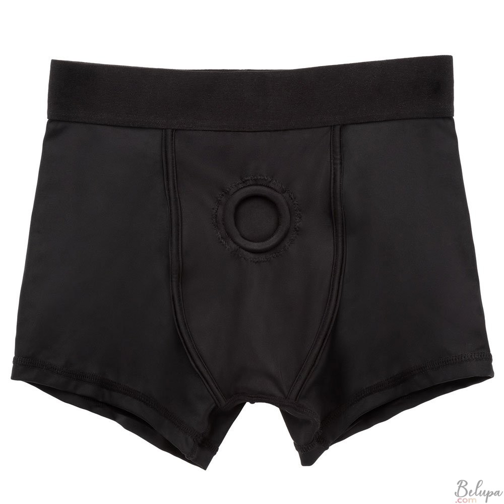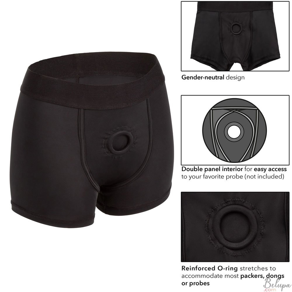 Speciale imbracatura BOXER BRIEF della linea Her Royal Harness del marchio CalExotics a forma di boxer aderente di colore nero. La specialità di questo slip aderente è l'anello sul davanti che ti consentirà di infilare qualsiasi dildo, vibratore, packer o protesi di un diametro fino a 5 cm circa con base allargata o a ventosa per non fare scivolare fuori dall'anello l'oggetto in questione. Essendo aderente potrai indossarlo tranquillamente sotto i normali vestiti tenendo questo segreto tutto per te. Tessuto 78% Nylon e 22% Spandex; la cintura è realizzata con 48% Nylon, 35% Poliestere e 17% Spandex. - Ulteriori informazioni