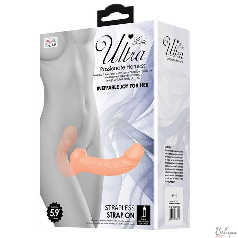 Strap-on senza lacci (strapless) per donna Ultra Passion da 24 x 3,8 cm di color pelle chiara. Questo strapon per donne è perfetto per un doppio godimento simulando il possesso di un pene. La parte più corta, che misura 9 x 3,8 cm, andrà ad adagiarsi perfettamente alla tua vagina garantendoti stabilità durante la penetrazione del partner. La parte esterna misura invece 15 cm con un diametro massimo di 3,3 cm. Il movimento della penetrazione garantirà godimento sia a te che al tuo partner. Realizzato in PVC di alta qualità e sicuro per il corpo.